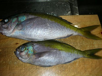ウメイロの刺身 三枚に下ろして皮を引いて透明感のある白身で脂がのっていると少し白濁して白い。 血合いが弱く見た目にも美しい。 見た目にも上品であるが、食べても見事である。 上品な甘味があって、淡泊な中にうま味が感じられる。 非常に美味。 飽きの来ない味である。 ウメイロの皮霜造り 小振りのものは三枚に下ろして血合い骨を抜く。 皮目に湯をかけて氷水に落とす(冷蔵庫で急冷 標準和名:ウメイロ 科:フエダイ科 旬:春~夏 関東では「沖タカベ」と呼ばれる魚。黄色い背中のラインが特徴的です。漁師さんが毎日食べても飽きない!と評価する程、美味しい魚なんです。この魚も、新鮮なら是非お刺身で食べていただきたい。